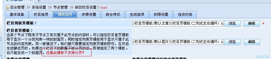注意看“栏目首页模板”的说明,首页模板不支持分页! 但是用户 实际指定的“/栏目页模板/默认图片父栏目页模板(二列式左右循环).html”是含有分页标签的,前台栏目首页模板解析的时候,分页标签是能够解析出来,但是实际分页页码的链接是指向到“栏目列表页”的分页,所以出现这种同一节点,分页模板不一致的怪现象。