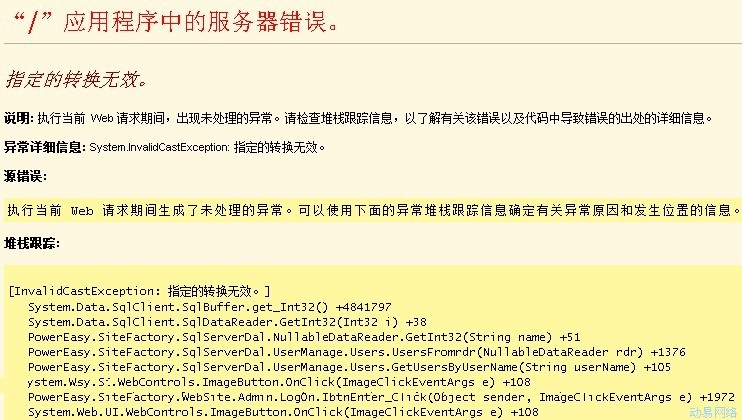 升级后前台正常,而后台登录时引起了“指定的转换无效”出错。如图: