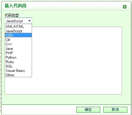代码段支持各种的代码类型,有JavaScript、XML/HTML 、 CSS C# C++ 、 Jave 、 PHP、 Python、 Ruby、 SQL、 Visual Basic 等等,您可以选择不同的代码类型。
