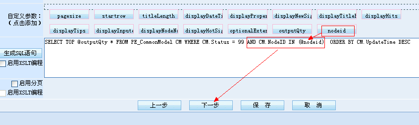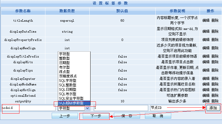 然进入“下一步”,在标签体代码处,加上一句参数设置语句: