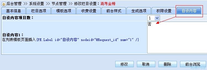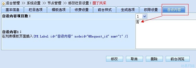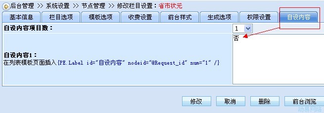 考虑到节点的设置部份,我们可以利用节点的“自设内容”处的功能来实现此节点是否要在“节点树形导航”里显示,如下图,我们设置给它一个值,比如:否 ----表示不显示,要注意这里“否”前后不能带有任何文字或空格(这是根据SQL语句设置的,当然大家可以修改SQL语句,把条件不要设置太高)