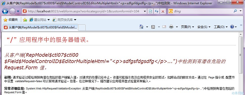找到相应的页面,如上的错误是由于webform.aspx中开启了请求验证(其它页面可能也有验证,所以要找到相应的出错页面),把webform.aspx中的请求验证关即可!