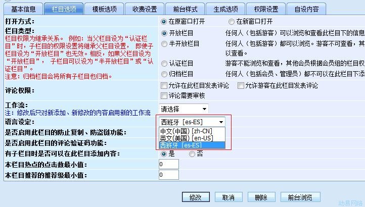 现在我们就可以添加西班牙语栏目了,在添加一个新栏目是我们就可以选择新添的西班牙语。