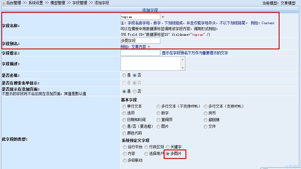 进入 系统设置 >> 模型管理 >> 内容模型管理 ,为文章模型,添加多图字段操作如下图: