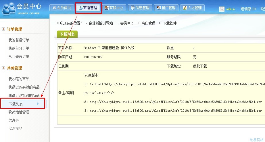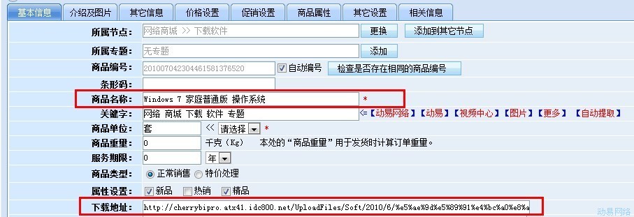 如果商家销售的商品是软件等虚拟物品的话,需要实现客户购买商品后,给客户开通软件的下载列表,这样的功能,在动易BI系统中,需要自定义一个商品性质属于下载类型的商品模型,客户购买后,就可以给客户开通下载,现在我们介绍一下下载商品模型的添加与开通下载的具体操作。