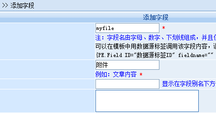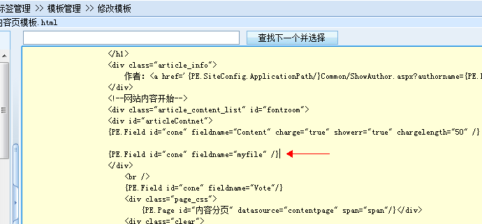 在适当的地方加上“{PE.Field id="cone" fieldname="myfile" /}”,如图: