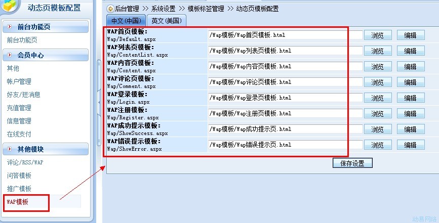 进入 系统设置 >> 模板标签管理 >> 动态页模板配置 ,绑定wap模板。