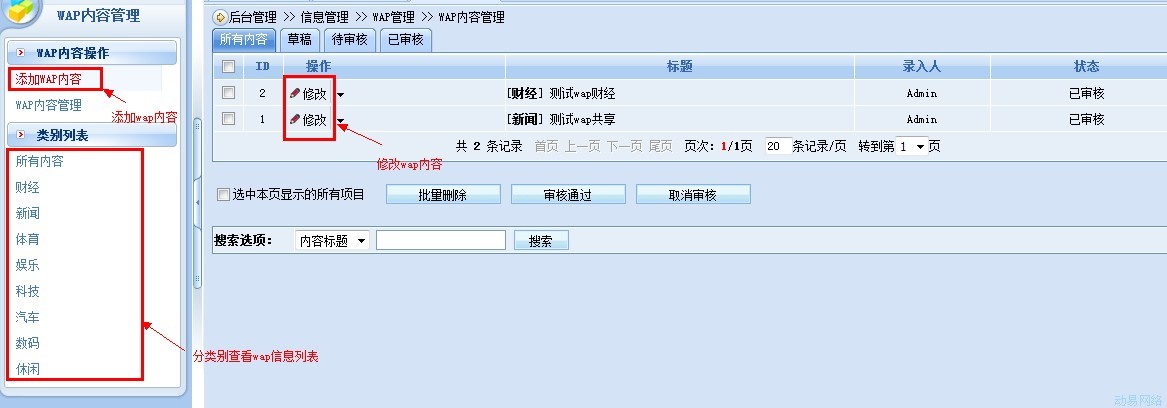 进入 信息管理 >> WAP管理 >> WAP内容管理 ,添加和修改wap内容。