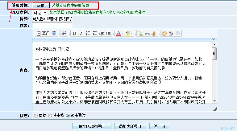 第二步:在信息管理中,添加信息的时候获取WAP内容: