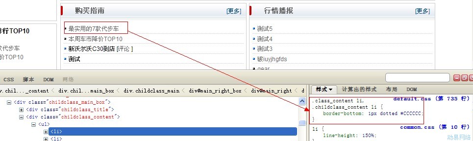 1、首先可以通过火狐浏览器,结合其插件firebug,这样访问页面的时候,就能很直观地查看到当前页面的CSS样式。如下图,红框中的代码就是对应着“最实用的7款代步车”这个标题CSS定义。