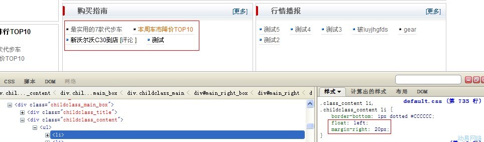 2、接下来就可以对这个地方的CSS代码进行修改,如下图,其中“float:left;”是浮左的意思,就是为了让第二个标题可以跟着第一个标题,排在第一行,从而形成二列式的效果,另外的“margin-right:20px;”是设置每个单元和右边的单元相隔20px,目的是为了把标题隔开一点。