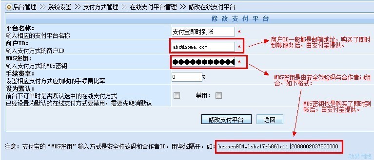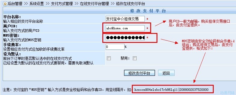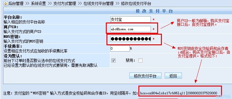 进入 系统设置 >> 支付方式管理 >> 在线支付平台管理 >> 修改在线支付平台 ,进行在线支付平台接口设置。支付宝接口设置:注意:必须购买支付宝3600元以上的套餐才是对应这个接口。套餐详情请咨询支付宝。 支付宝中介担保交易接口设置: 支付宝即时到账接口设置: 注意:这三种支付宝接口是不同的,对流量和额度的限制都不同,填写的时候要看清楚。购买详情请向支付宝咨询。
