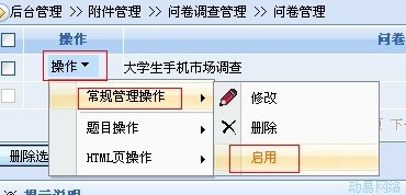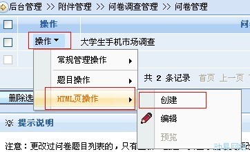 第三步:添加完问题后,选择 “HTML页操作”中的“创建”,创建问卷的页面。然后选择“常规管理操作”中的“启用”。