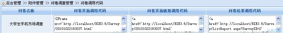 第四步:到附件管理 >> 问卷调查管理 >> 问卷调用代码 选择需要调用的代码,不同的代码带来的前台显示效果不同,然后把代码粘贴到相应模板中即可在前台使用问卷调查了。