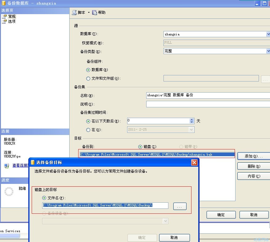 第二步:大部分的选项都以默认即可,然后目标选项可以更改为自己想要的路径存放数据库备份,红框为默认存放地址,可以点击删除,然后重新添加新的地址存放备份。注意:重新添加路径备份的时候,路径必须要指定到文件名,如D:Program FilesMicrosoft SQL Serverschool.bak