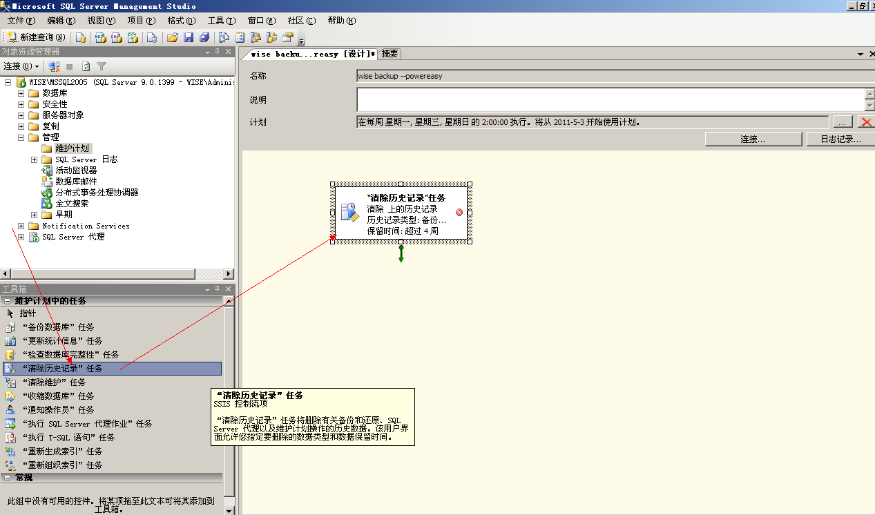 数据库在配置了自动备份之后,时间一长备份的目录原来越大,需要管理员手动去选择性的删除备份的文件,通过如下教程所示管理员只需要设定任务计划,数据库自动地删除原来老的备份。