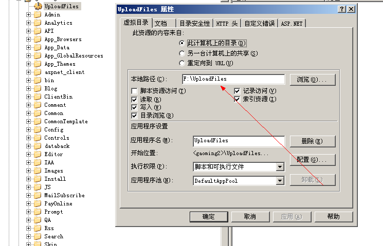 上传目录修改至其他盘只需要把网站根目录下面的UploadFiles文件夹复制到想要的路径总去,然后在该站点上新建虚拟目录,虚拟目录选择改路径就可以了。这样就避免了网站目录越来越大,网站所在的分区空间越来越少的问题。