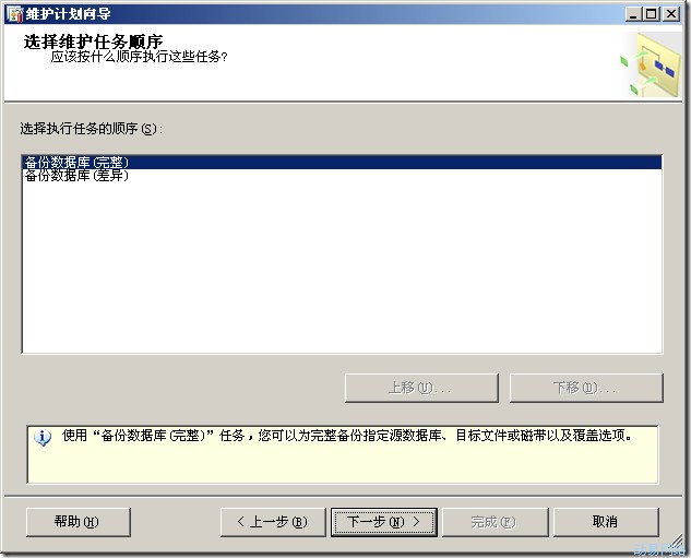 (4)单击“下一步”进入选择维护任务顺序的界面,这里我们可以看到选中的任务出现在列表中,但是我们并不能调整其顺序,那是因为在步骤2中我们选择的是每项任务单独计划,所以这2个任务是独立的,没有先后顺序可言。如果当时选择的是另一个选项,那么这里就可以调整顺序了。