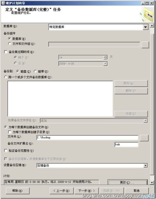 这个界面实在太长了,我把任务栏隐藏了都显示不完,出现了滚动条,这里我们选择要进行备份的数据库,选择为每个数据库创建备份文件,文件保存在C盘 Backup目录下,扩展名是bak,出于安全起见,我们可以选中“验证备份完整性”,当然也可以不选。在SQL2008中提供了压缩备份的新特性,使得备份文件更小,备份速度更快,这里我们就是由压缩备份。最后是选择执行计划,我这里选的是每周日晚上0点的时候执行。