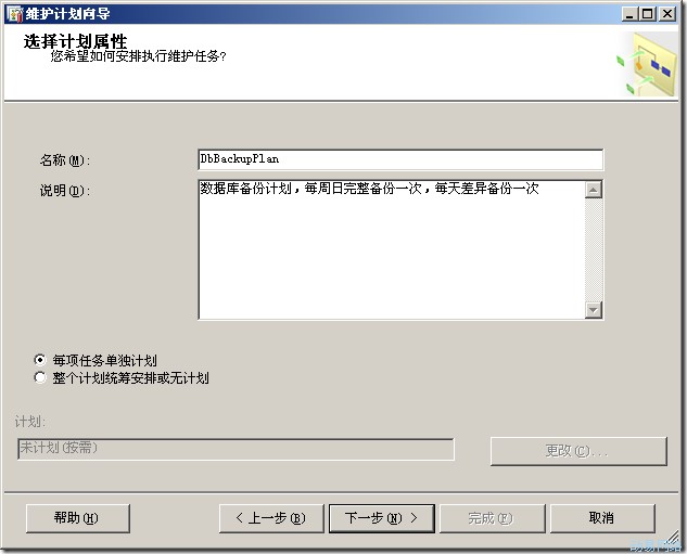 (2)点击“下一步”按钮,进入选择计划属性窗口,输入计划的名称,由于我们的计划包括2部分:完整备份和差异备份,这2部分的执行计划是不一样的,一个是一周执行一次,另一个是一天执行一次,所以要选择“每项任务单独计划”,如图: