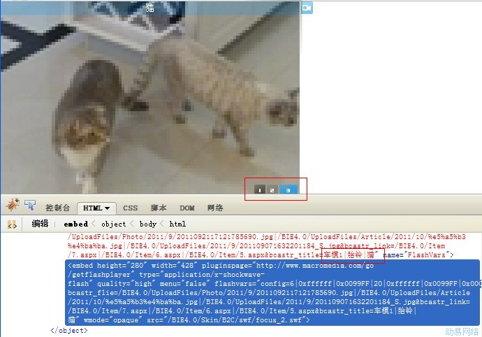 注意上图的两个红色框,通过火狐的FIREBUG插件可以看到,此焦点图标签一共查询出的焦点图数量是3个,分别是“车模1”、“胎铃”和“猫”,理所当然地,图中鼠标移到数字3,所以焦点图显示的就是文章“猫”的图片,但是当鼠标移动到数字2的时候,却没有显示出文章“胎铃”的焦点图,而当鼠标移动到数字1的时候,焦点图又正常地显示了文章“车模1”的焦点图了。