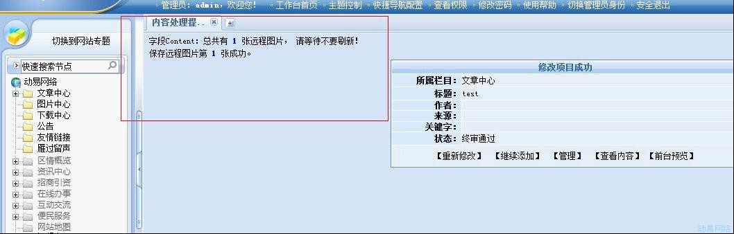 提问:在添加编辑内容时,提示获取远程保存图片失败。 解决方法: 1.检查网站后台配置是否正确。 1.检查服务器的防火墙禁用端口是否有屏蔽。 3.检查完成后,保存成功。