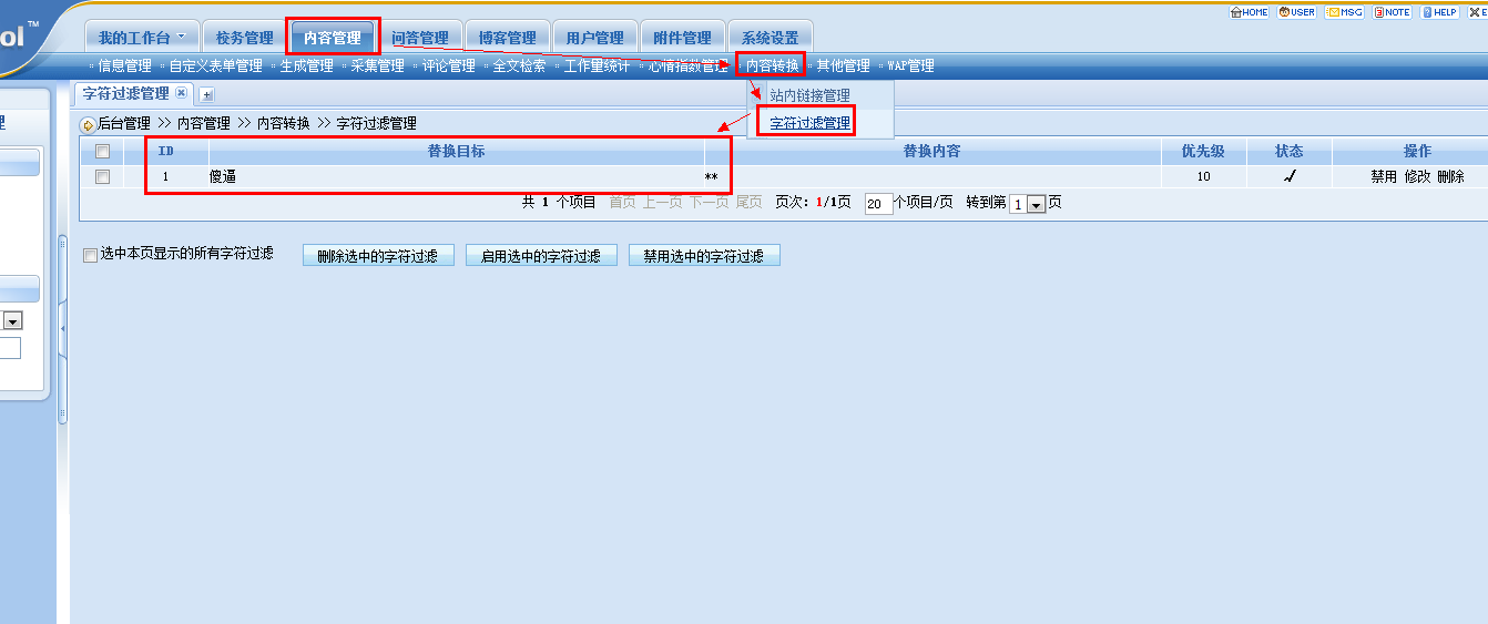 问题:在后台设置好过滤规则之后,留言、评论等处并没有根据过滤规则进行过滤。字符过滤设置位置: