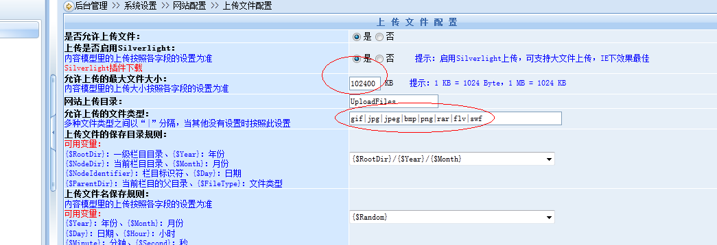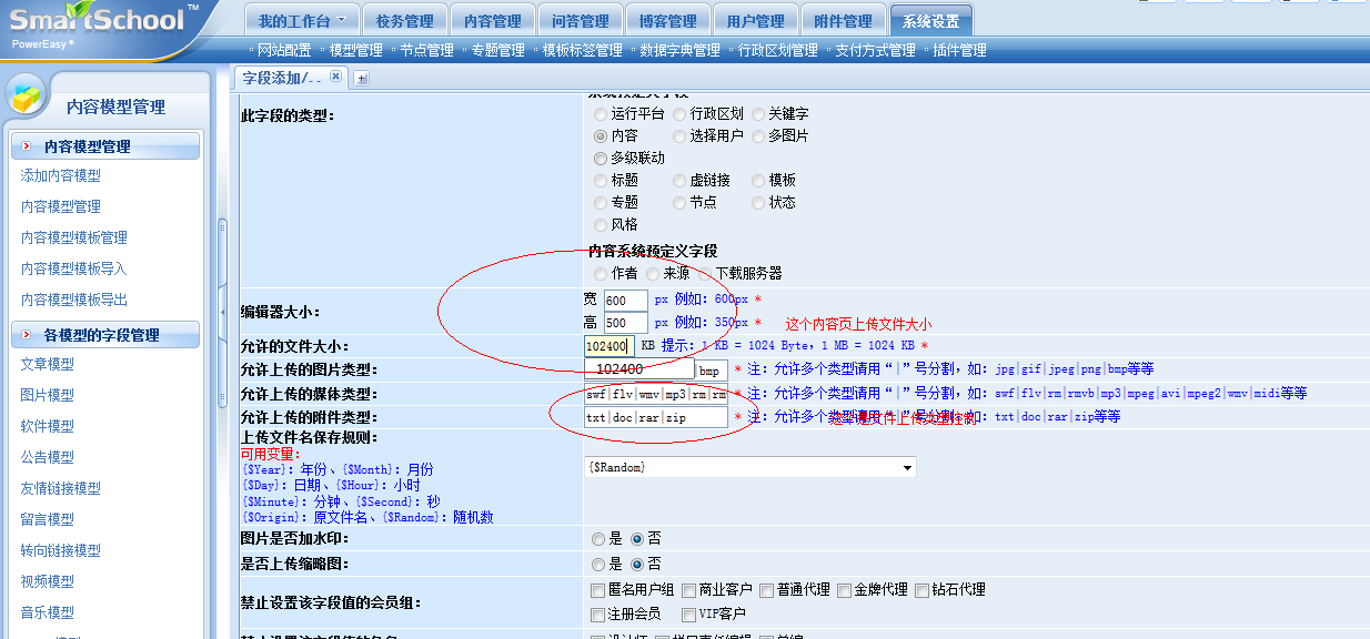 红圈中设置文件大小设置及上传文件的类型。