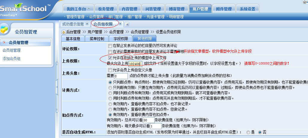 如何设置会员上传文件大小及权限