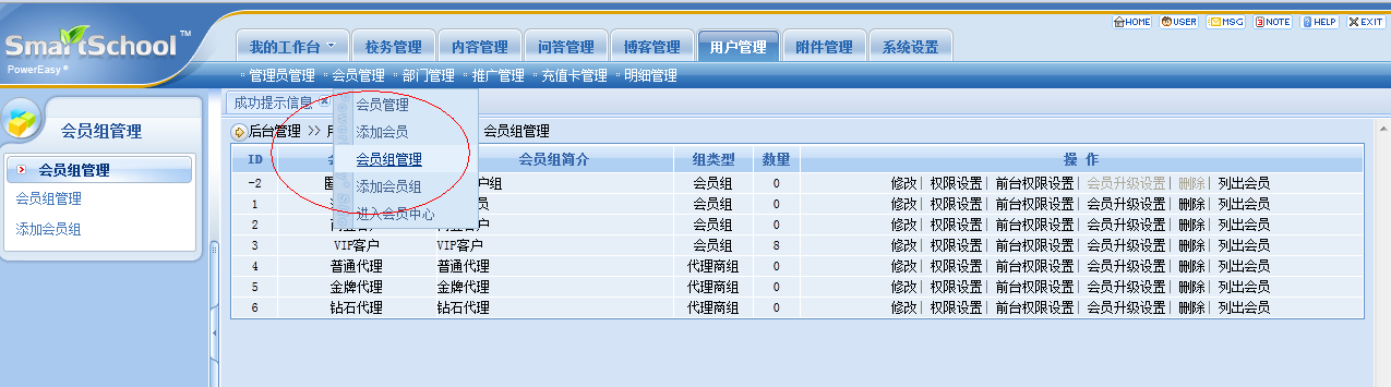 提醒会员的权限,由会员组权限来设置,当然,也可以单独来设置会员权限。这种权限设置不推荐,最好用会员组。