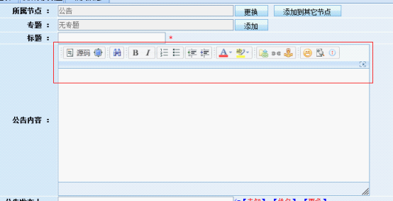 添加公告、留言等的内容字段编辑器增强功能 来源:本站原创 点击数: 次 发布时间:2011年12月07日 1.后台管理 >>内容管理 >>信息管理 >>公告 >> 添加公告 2.后台管理 >>系统设置 >>模型管理 >>字段管理 选中标准或者增强即可 效果图: