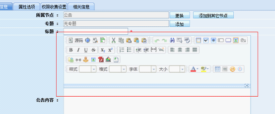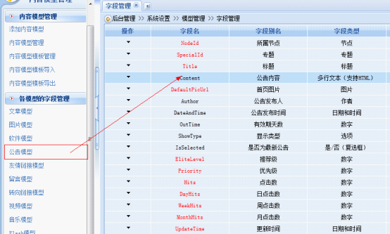 1.后台管理 >>内容管理 >>信息管理 >>公告 >> 添加公告 2.后台管理 >>系统设置 >>模型管理 >>字段管理 选中标准或者增强即可 效果图: