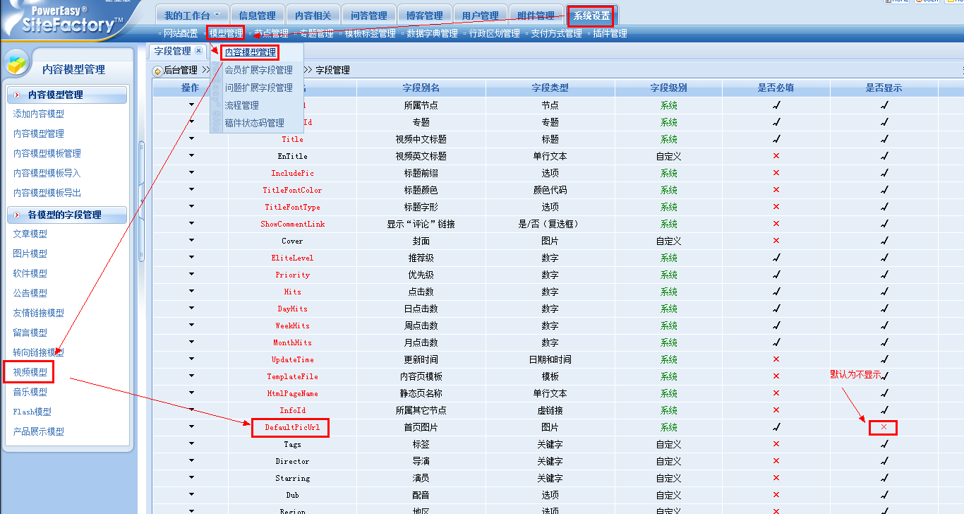 解决方法:开启模型中的DefaultPicUrl字段。下面以视频模型为例: