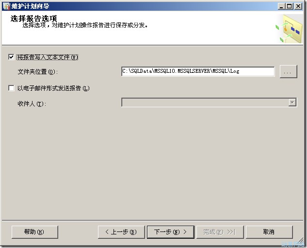 (7)单击“下一步”按钮,进入选择报告选项,这里我们可以将这个维护计划的执行报告写入文本文件中,也可以讲报告通过电子邮件发送给管理员。如果要发送邮件的话,那么需要配置SQL Server的数据库邮件,另外还要设置SQL Server代理中的操作员,关于邮件通知操作员的配置网上也讲的比较多,我这里就不详述了。
