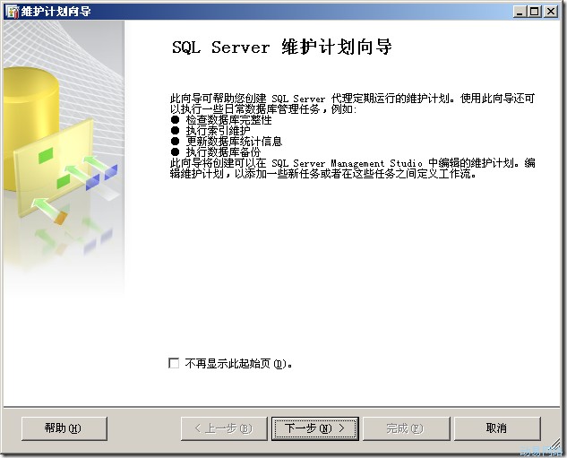 (1)在SSMS的对象资源管理器中右击“维护计划”,选择 “维护计划向导”,系统将弹出向导窗口,如图: