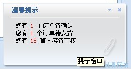 我们系统后台右下角有一个冒泡提示功能,当有权限的管理员登陆后台后,就会在右下角弹出一个小窗口,提示管理员有哪一些工作需要做,如下图: