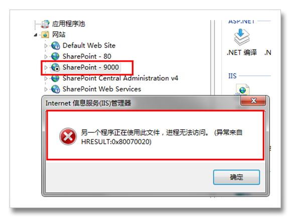 在IIS中不能启动网站,提示:“另一个程序正在使用此文件,进程无法访问”
