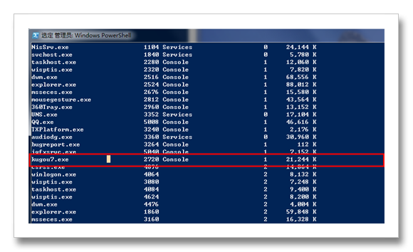 2、在PowerShell或DOS,输入 tasklist , 查看任务列表, 找到刚才PID=2720的应用程序,这里找到为 Kugou7, NND,原来被kugou占用了! 病因找到了!