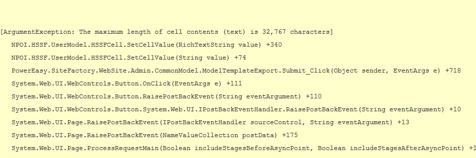 原因分析:通过测试,不是系统的原因,当我们插入字段超过54个或者55个的时候,我们系统不会报任何错误,在导出的时候会报错,原因是我们导出的时候,必须导出到excel,我们我们分析excel,发现导出后,在一个单元格里面装的是模板代码: