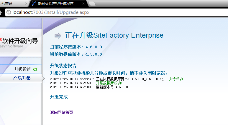 升级完成。点击:“返回网站首页”,完成升级。