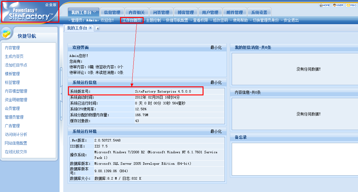 1、登陆网站后台,在后台首页(我的工作台)可查看系统名称及版本号,如图: