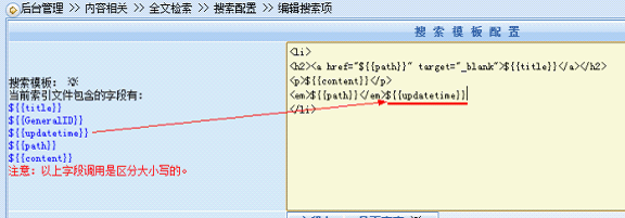 为了然效果明显些我们把刚刚加入的updatetime字段显示到搜索模版中。