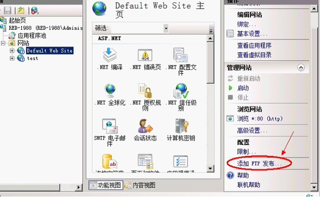 接着,进入 IIS 管理器,选择一个需要添加 FTP 功能的站点,点击右侧 “添加 FTP 发布...”