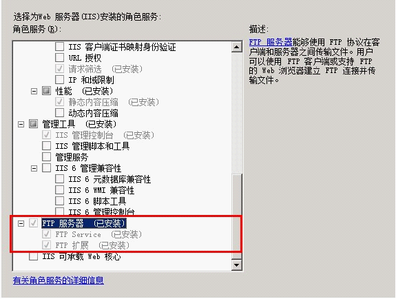 首先,确定 IIS 中已经添加 FTP 的角色服务