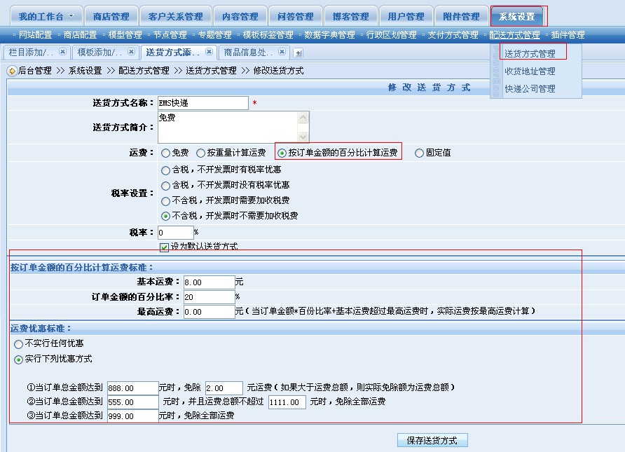 根据红框进入需要设置的送货方式修改页面,然后对各参数值进行设置,如果选择了“按订单金额的百分比计算运费”,那么“按订单金额的百分比计算运费标准”这里的三个参数必须要填写值,如果其中一个没填写,将会导致最终的商品运费一直为0。