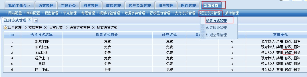 对于网上商店,那么配套的就肯定需要快递送货了,不可能所有商品都上门取货,所以设置正确的送货方式是必须的,如下图: