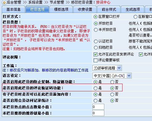 问题分析:通过上图中可以看到,通过火狐浏览器的firebug插件发现了在点击确定的时候出现了错误,错误代码“document.getElementById("TxtValidCode") is null”,通过这段代码的分析,可以判断是因为评论PK缺少了验证码而造成这个问题,但是在这个评论PK窗口中却没发现有验证码输入的地方。联想一下其他方面,就能想到在后台是可以在节点管理中设置文章评论的时候是否启用验证码,如下图: