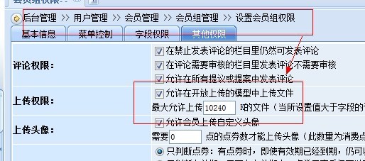 解决方法:我们修改的系统设置中的上传文件大小是网站后台上传的大小, 但是在前台会员上传文件时是没有权限的,所以要在用户管理中设置指定会员或者会员组的上传权限。(如下图所示)