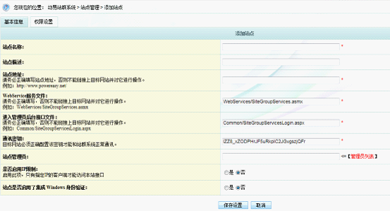 在此页面录入需要集成的目标站点名称与站点地址,并且为其选择一个站点管理员(这是站群系统中的管理员),其他项保持默认就可以,点击保存设置。