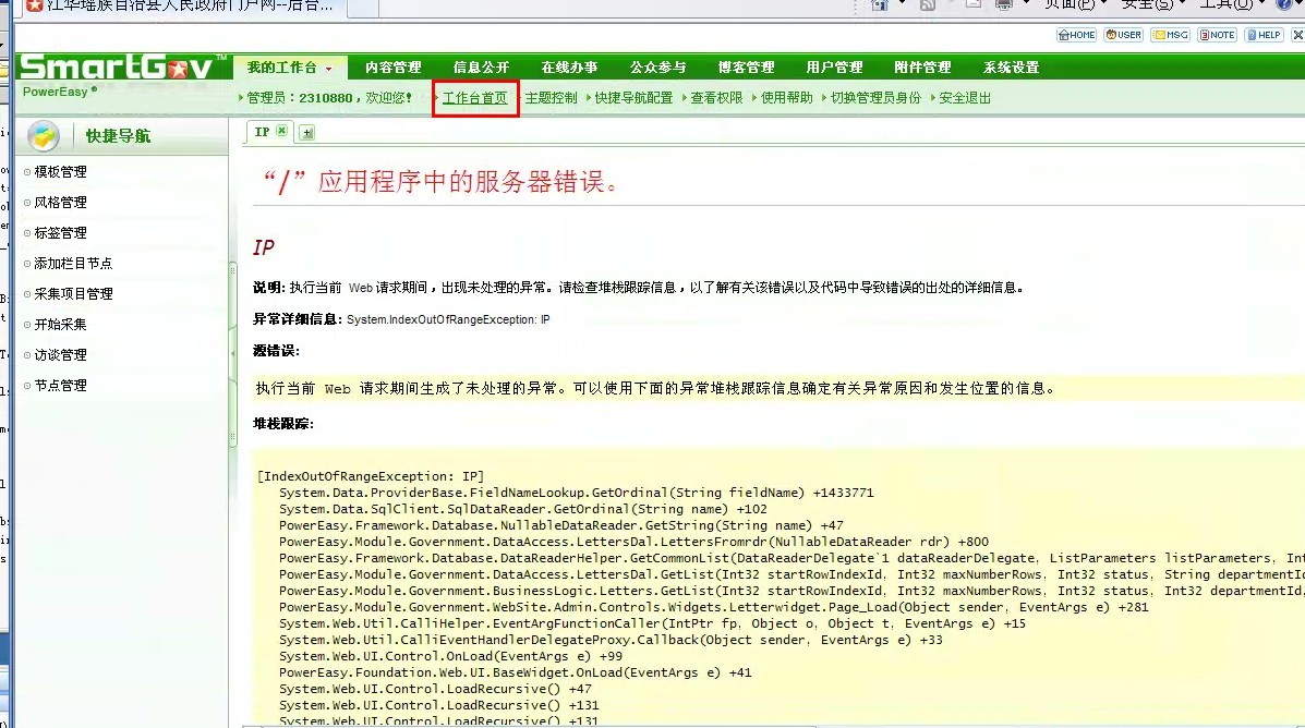问题描述:升级后,登录某账号网站的后台,发现“我的工作台”页面报错,其他页面没任何异常。而登录其他的管理员账号却可以。